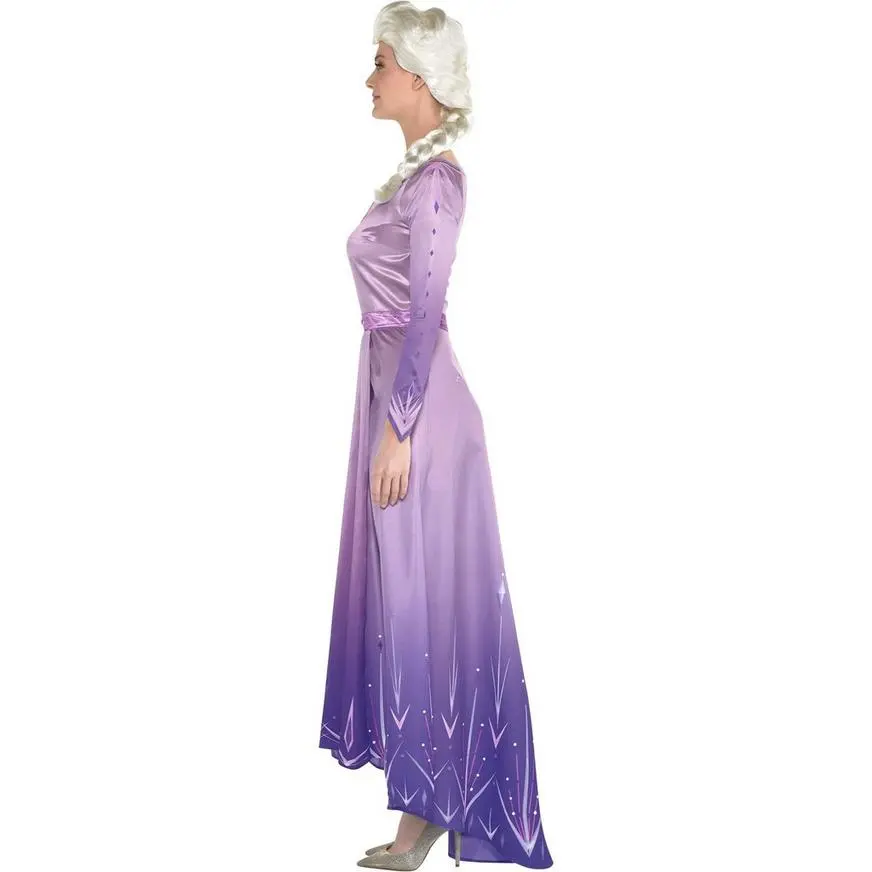 Unleash Elsa’s magical powers in the Act 1 Elsa Costume for adults! Like Elsa’s outfit in Disney’s Frozen 2 movie, this costume features a long sleeve purple high-low dress with faux value details on the bodice and a faux skirt inset with crystal screen printing. Shine and sparkle like Elsa with the attached decorative faux belt and gemstone detail. Review the size chart for additional sizing information. Shoes and wig not included.