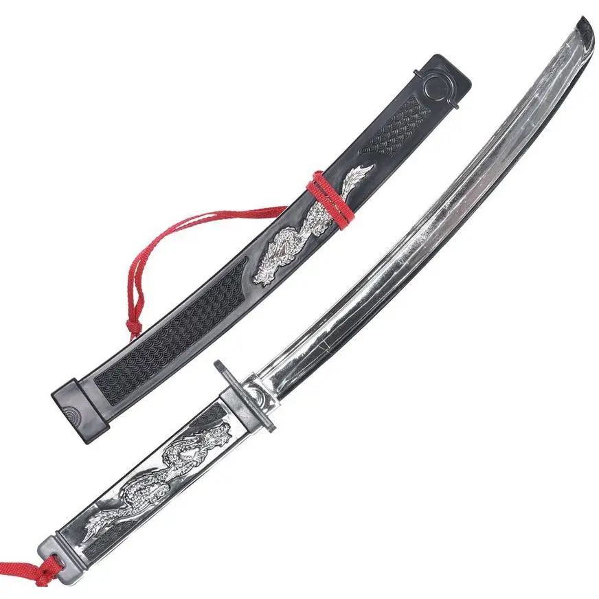 Be an ultimate fighting machine with this Combat Ninja Sword in hand! This ninja sword features silver dragon details on the handle and scabbard, a red cord shoulder sling, and a shiny silver blade. Use this Combat Ninja Sword as part of your overall Halloween ninja costume for a totally sharp look!