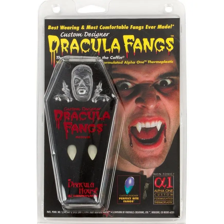 The original vampire fangs in a coffin! Create the ultimate vampire costume with our Designer Dracula Fangs. Custom Designer Dracula Fangs are Perfect Bite Fangs made of non-toxic, custom formulated Alpha 1 thermoplastic to create the perfect fit over your own teeth, streamlined for comfort and double chambered for superior anchoring. Easy step instructions included. Package includes one pair of Custom Designer Dracula Fangs in a novel plastic coffin case with application materials.
