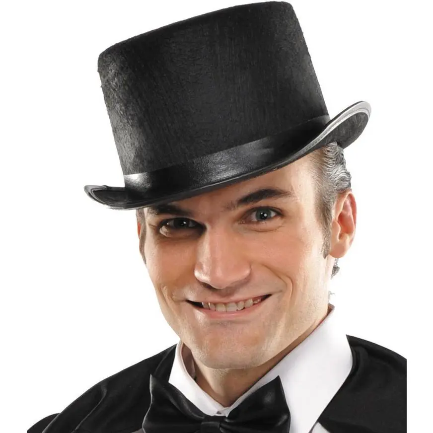 Congrats — this Top Hat makes you a member of high society, a landed 19th century gentleman. This felt Top Hat features a vintage gothic design with a high flattened crown, a narrow brim turned up at the sides, and a gleaming faux leather hatband. It’s lined for comfort, hemmed with faux leather, and made to last well into the 20th century.