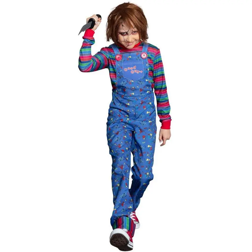 She’ll scare the pants off everyone as the infamous killer doll Chucky! This creepy costume features a jumpsuit with an attached striped long-sleeve shirt and attached blue overalls that have “Good Guys” in red letters on the chest pocket.