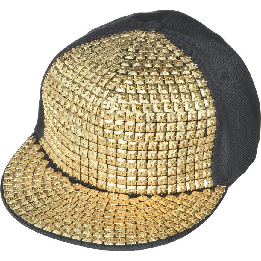 Keep your hip hop costume fresh with a Gold Studded Hip Hop Hat! This black flat-brimmed baseball hat features gold studs on the front to show off your funky side. The adjustable band in the back allows for a custom fit.