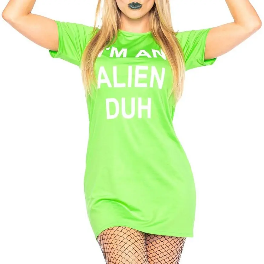 More on Adult Sassy Alien Costume: Get your hands on this Sassy Alien Costume for adults and get dressed for an extraordinary night! The neon green t-shirt dress features the headline “I’m An Alien Duh” across the chest to make sure you stand out amongst the paranormal creatures. Top off the outfit with the included antenna headband to give yourself that classic dress-up look. Use this costume set as a foundation for your very own accessorized ensemble! Review the size chart for additional information. Shoes, makeup, and tights not included.