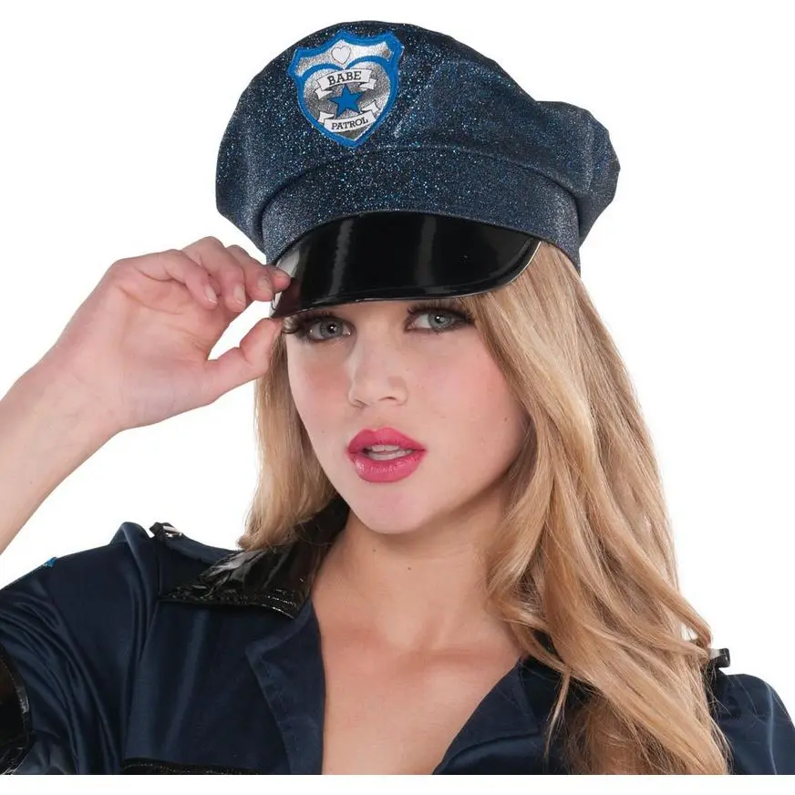 Strike the pose of a law enforcement hottie! This Sexy Police Hat is made of shimmering blue fabric with a silver “Babe Patrol” badge on the front. The black visor in the front enforces your authority, while a snap closure in the back makes it easy to pull on and off. A fun way to protect and serve!