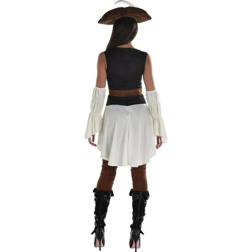 Try not to cause a shipwreck in this fabulous pirate costume! This costume includes a knit catsuit that features a cream-colored shirt, a decorative lace-up corset, and a faux-suede belt and straps. Cream-colored sleevelettes and a faux-suede tricorn hat complete this swashbuckling costume.