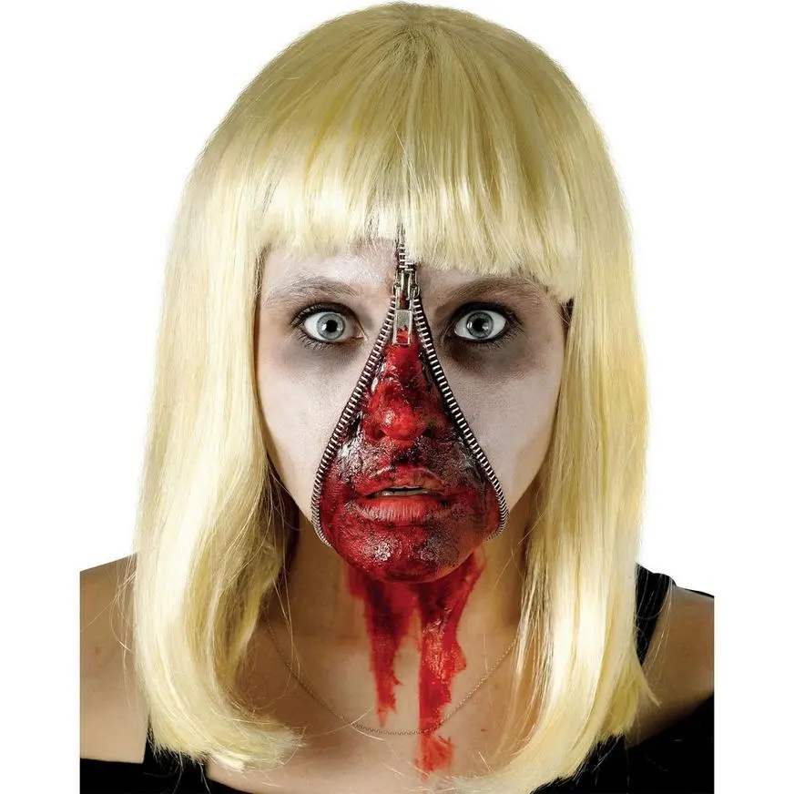Make trick-or-treaters come undone! Our Zipper Makeup Kit will transform your face into a gross display of separated skin. Kit includes a 7in long zipper, black and white makeup, two sponges, an application brush, and tubes of Spirit Gum, Spirit Gum Remover, and Bloody Scab. This makeup kit comes with easy application and removal instructions. Recommended for ages 15 and up.